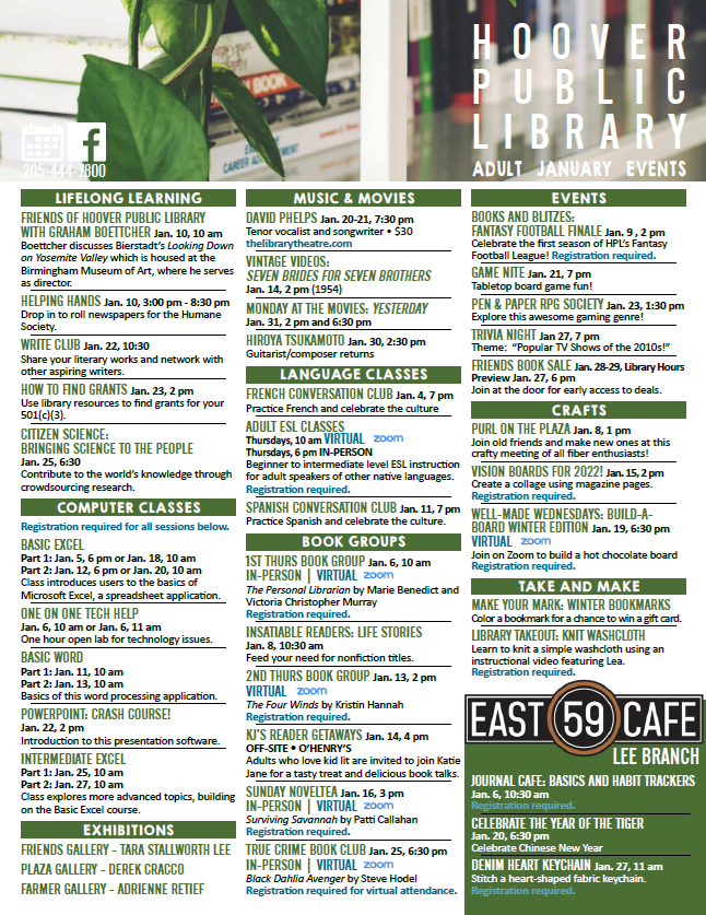 | Manage Subscriptions or Unsubscribe | Subscribe via RSS or ATOM Feeds | View Online If you are having trouble unsubscribing from this email, please contact: Hoover Public Library at 205-444-7800, 200 Municipal Dr. Hoover, Alabama 35216 hvcontact@hooverlibrary.org | ||||||||